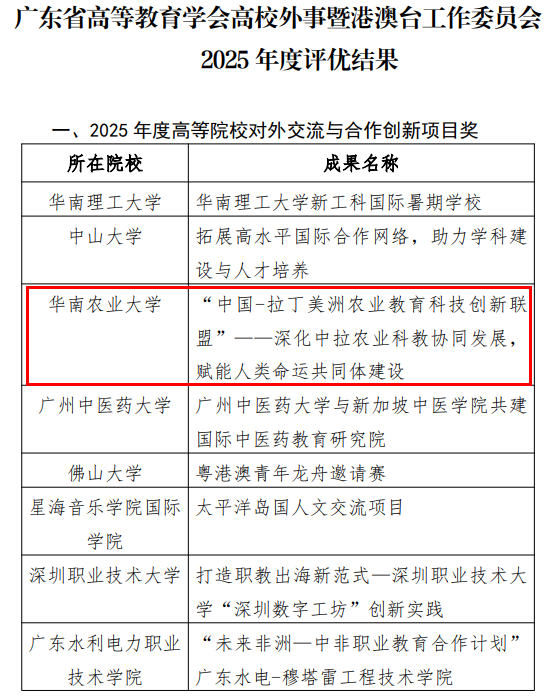 近日,广东省高等教育学会高校外事暨港澳台工作委员会2025-2026年度工作会议在广州召开,公布了2025年度评优结果。华农报送的两个涉外交流项目荣获表彰。《“中国-拉丁美洲农业教育科技创新联盟”——深化中拉农业科教...